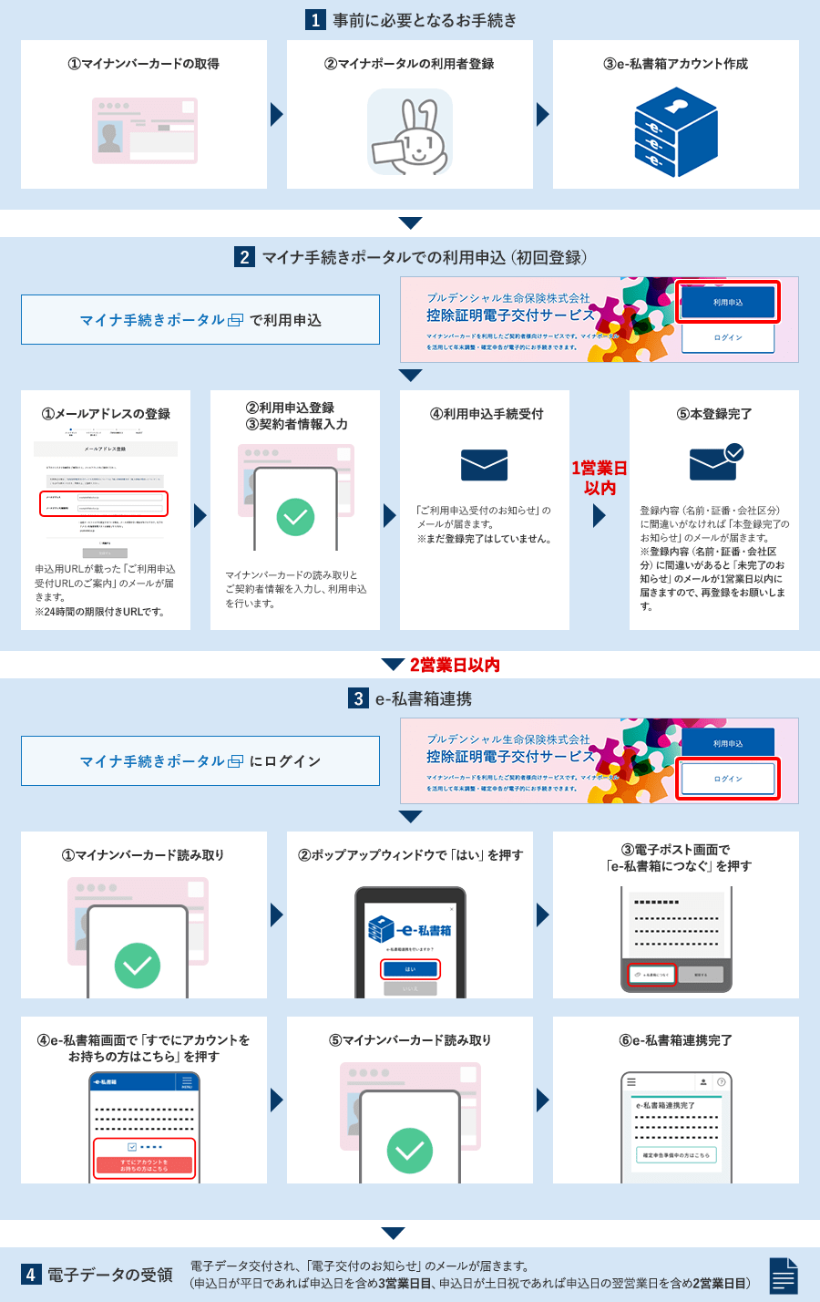 不備のない申込から電子交付まで、最短で受付日を含めて3営業日お時間をいただきます。お早めにお手続きをお願いいたします。 - 2以下の場合、当サービスをご利用いただけないことがございます。その場合には、登録住所へ郵送する生命保険料控除証明書にてお手続きいただきますようお願いいたします。