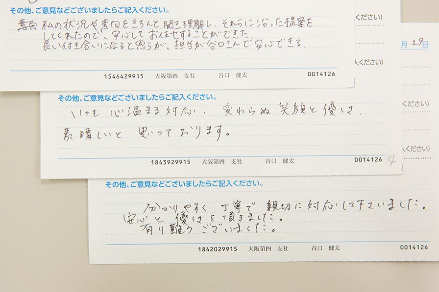 - その積み重ねは、確実に安心感という形で実を結んでいるよ。象徴的なのが、お客さまからのサンキューレター。一般的によく頂くのは「●●さんのおかげでいい保険に出会えました」というコメントなんだけど、谷口君の場合は少し違う。「安心と優しさをいただきました」「担当が谷口さんで本当に安心です」と、お客さまが“安心”を感じている。どんなに丁寧な対応でも、意識がセールスに向いていれば必ず伝わってしまうからね。日々の愚直な行動がお客さまに届いているんだよ。